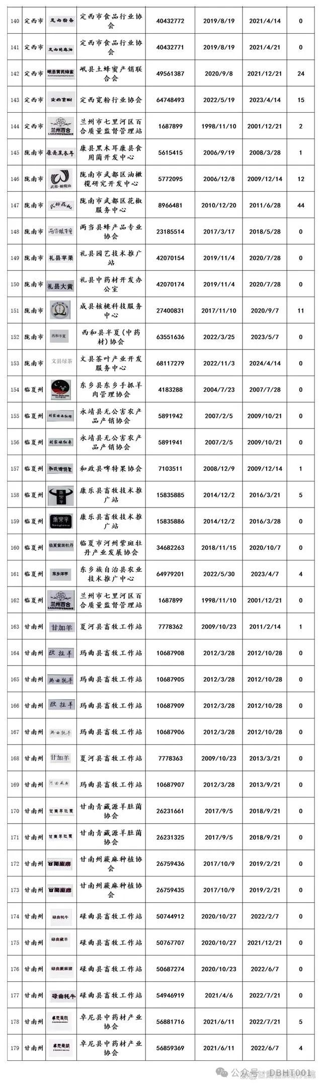甘肃省地理标志证明商标统计表